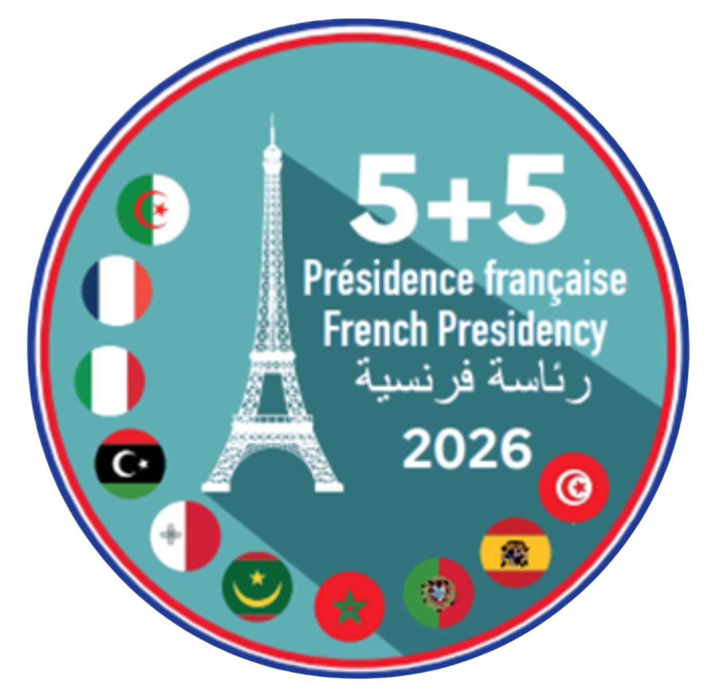 The designation 5+5 inscribed in red identifies the countries of the North and South of the Western Mediterranean that belong to this organization.
